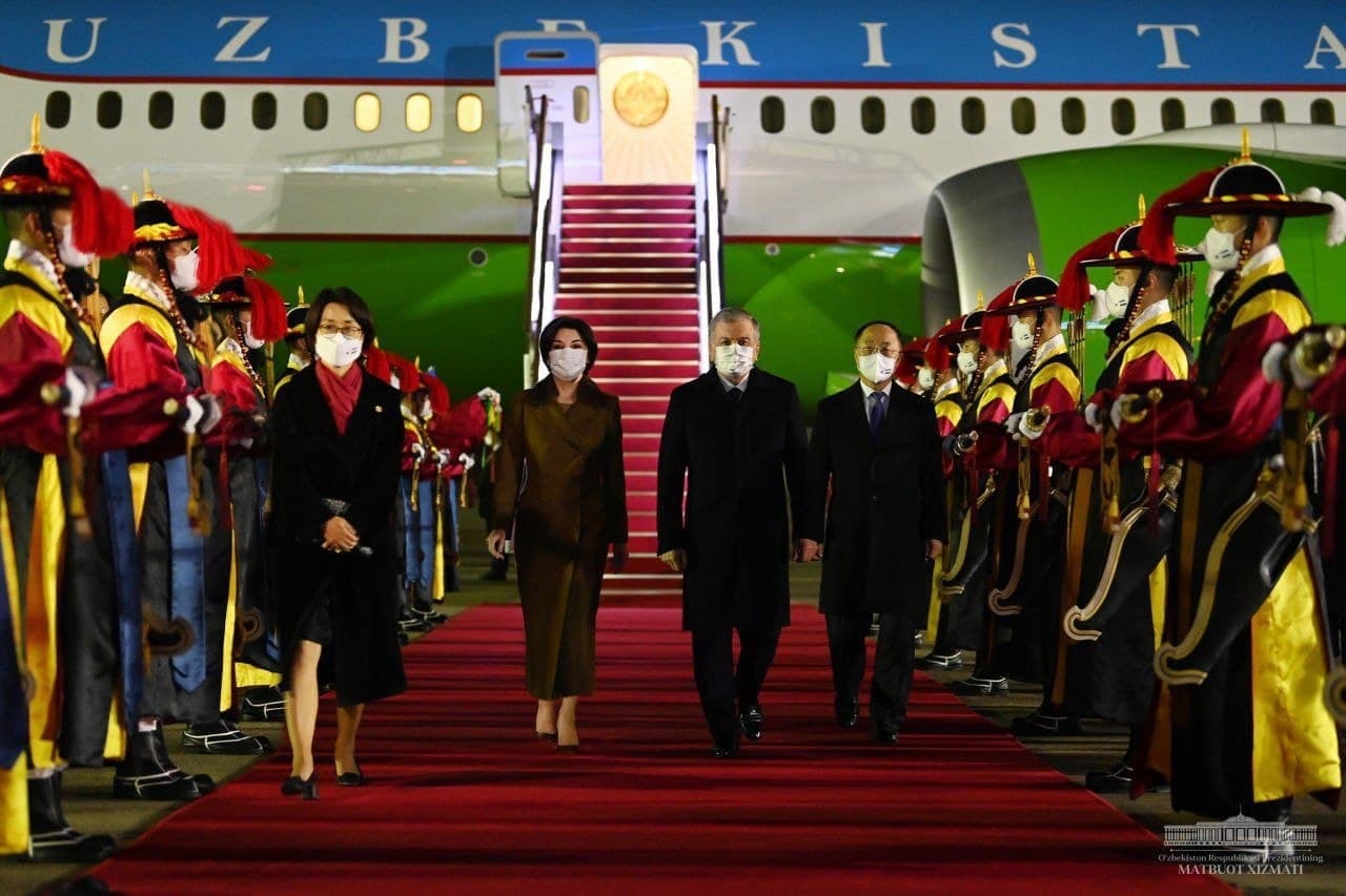 Seul shahridagi aeroportda Shavkat Mirziyoyevni tantanali kutib olish marosimi bo‘ldi. Oliy martabali mehmon sharafiga faxriy qorovul saf tortib, artilleriyadan to‘plar otilgan.