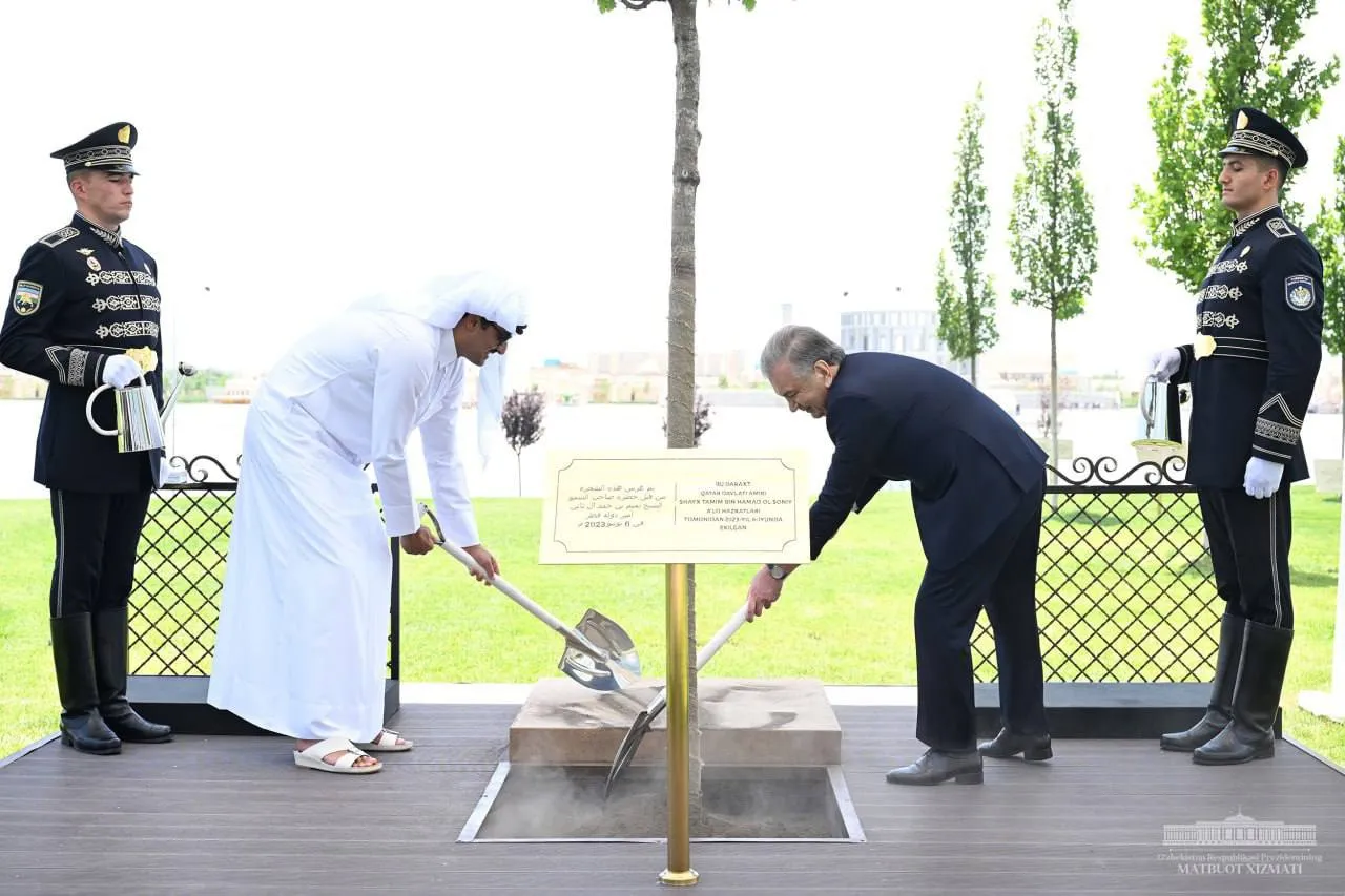 O‘zbekiston Respublikasi Prezidenti Shavkat Mirziyoyev va Qatar Amiri shayx Tamim bin Hamad Ol Soniy Samarqanddagi Kongress markazi bog‘ida birgalikda daraxt ekdilar.