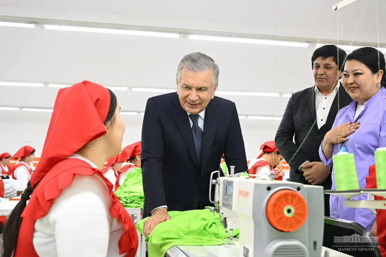 Prezident bu yerdagi ishlab chiqarish jarayonini ko‘zdan kechirdi, tikuvchi xotin-qizlar bilan suhbatlashdi.
