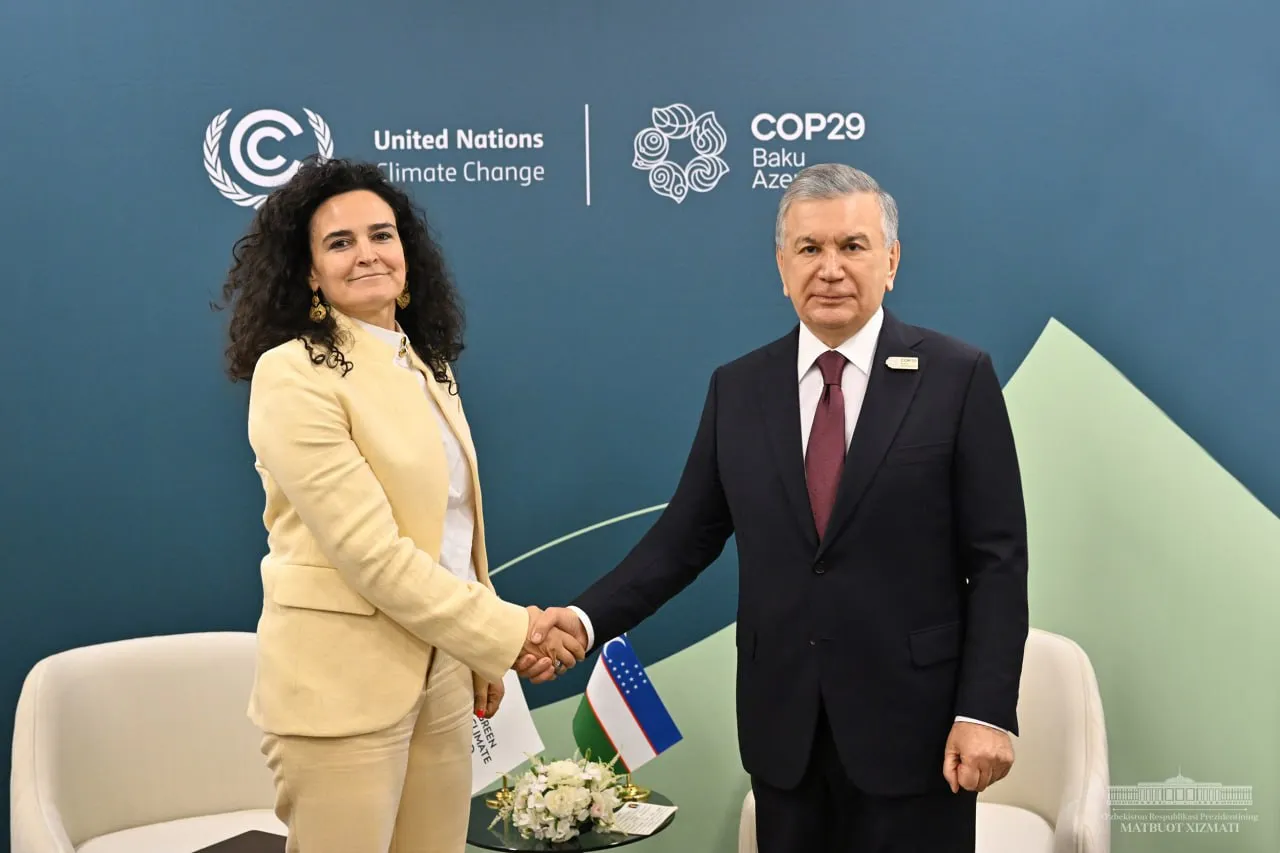 O‘zbekiston Respublikasi Prezidenti Shavkat Mirziyoyev Boku shahriga amaliy tashrif doirasida Yashil iqlim fondi ijrochi direktori Mafalda Duerteni qabul qildi.