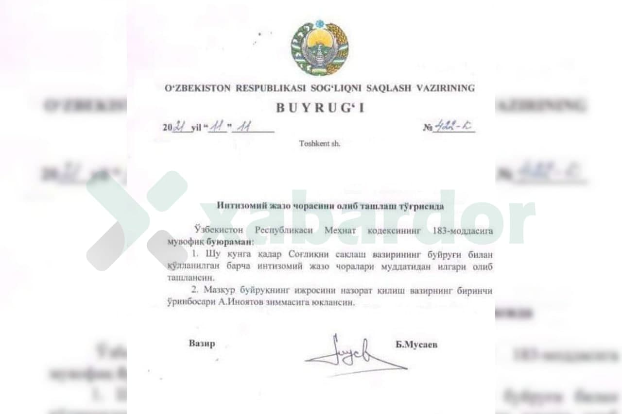 Buyruqda vazir Mehnat kodeksining 183-moddasiga muvofiq, “shu kungacha Sog‘liqni saqlash vazirining buyrug‘i bilan qo‘llanilgan barcha intizomiy jazo choralari muddatidan ilgari olib tashlash” haqida aytiladi va ijrosi vazirning birinchi o‘rinbosari A.Inoyatovga yuklatiladi.