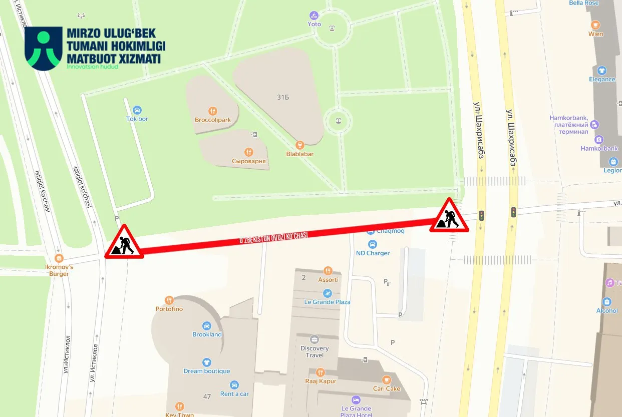 Shu munosabat bilan 18-oktyabr soat 14:00dan boshlab, 20-dekabrga qadar “O‘zbekiston ovozi” ko‘chasining Shahrisabz ko‘chasi bilan kesishmasidan, “O‘zbekiston ovozi” ko‘chasining Istiqlol ko‘chasiga qadar qismi vaqtincha avtoulovlar harakati uchun yopiladi. Bu haqda Mirzo Ulug‘bek tumani hokimligi xabar berdi.